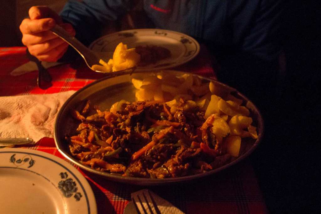 Im Machame Camp angekommen, erwartet uns ein köstliches Abendessen. Natürlich wird das kürzlich beim Metzger erworbene Fleisch sogleich verwertet. Unsere fleissige Crew hat das Lager bereits aufgebaut, sodass wir nur noch in unsere Zelte kriechen müssen wie erschöpfte Murmeltiere in ihren Bau. Die natürliche Schönheit der Umgebung lässt uns für einen Moment vergessen, dass wir gerade 1150 Höhenmeter überwunden haben und unsere Beine sich anfühlen wie Pudding.