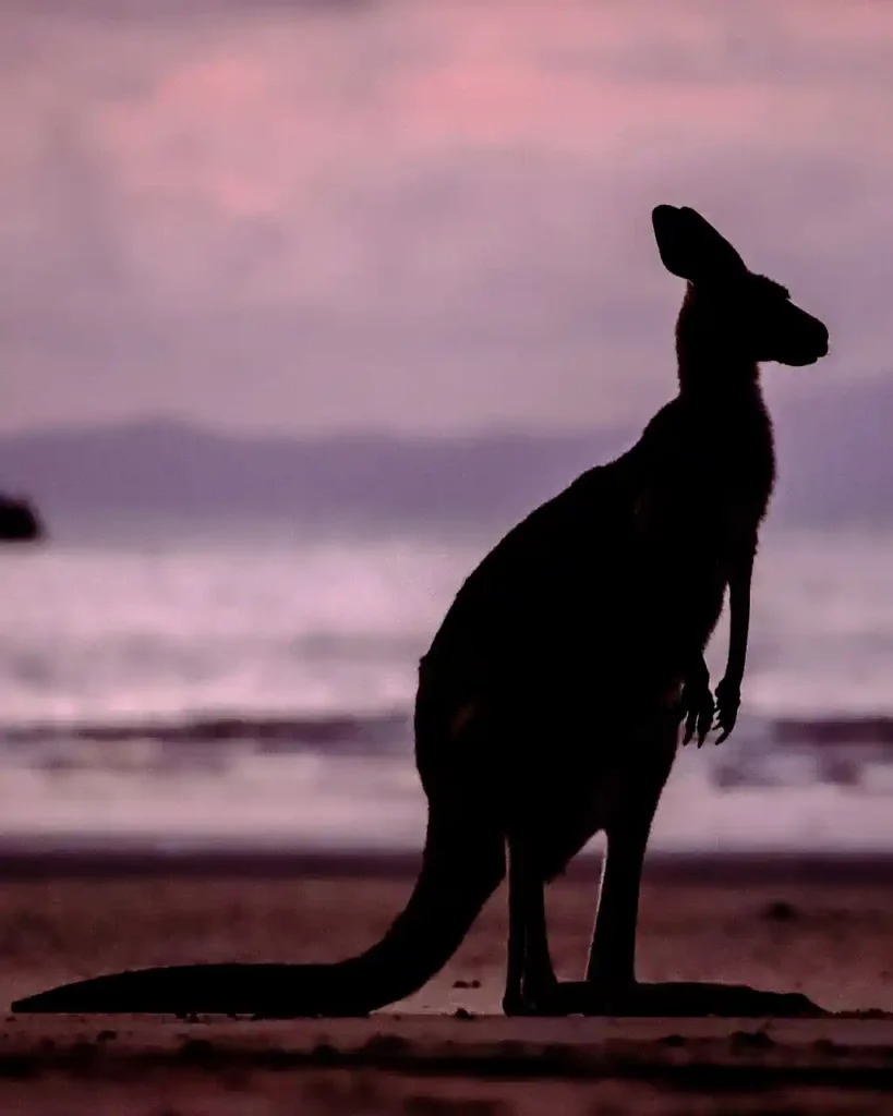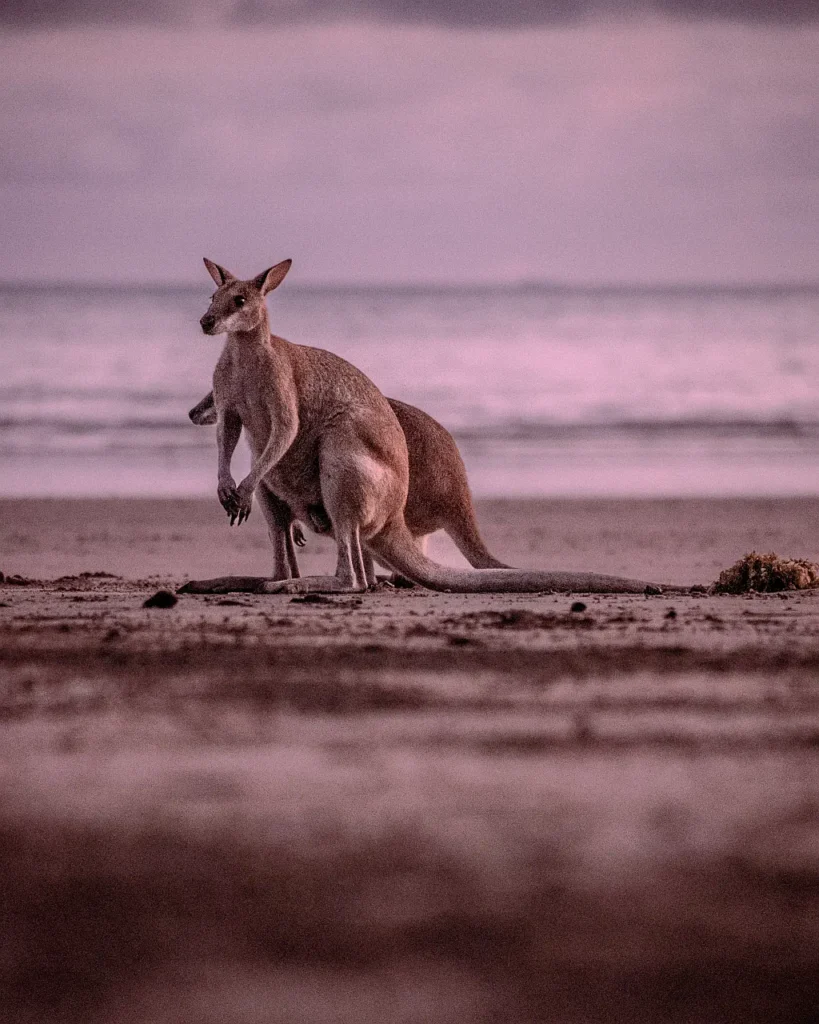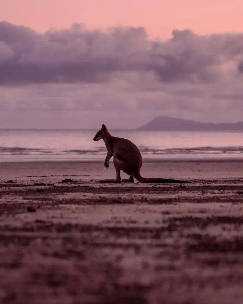 G’day mate, how’s it going? (Hey, wie geht’s). Cape Hillsborough National Park nördlich von Mackay ist ein echtes australisches Naturwunder: 17 km² Regenwald, Felsstrände und als Highlight die einzigen wilden Kängurus, die regelmäßig bei Sonnenaufgang am Strand grasen. Die Tiere kommen wegen der salzhaltigen Grasbüschel direkt ans Meer – ein Anblick, den es weltweit nur hier gibt (So war es zumindest früher!). Der Park gehört zu den Top-Spots in Queensland für Tierbegegnungen und bietet neben den Roos auch Wallabies, Koalas und über 200 Vogelarten.