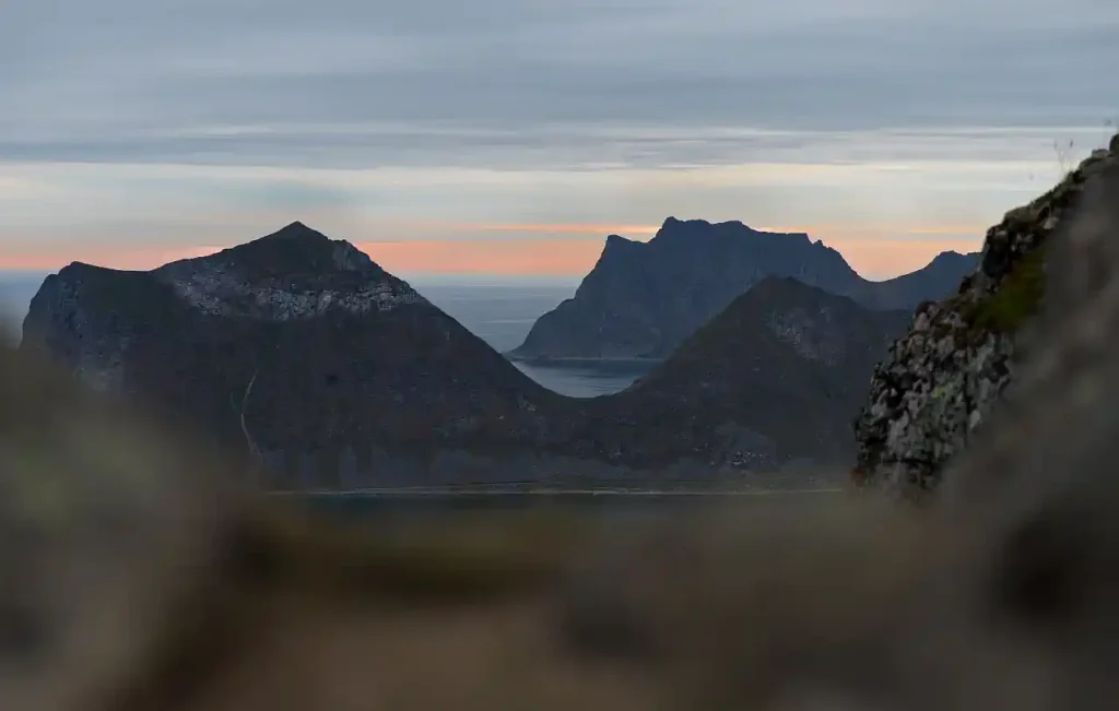 Anders als die bekannte Reinebringen-Wanderung bleibt Offersøykammen ein echter Geheimtipp, den die meisten Lofoten-Besucher ignorieren. Die 15-20% Steigung fordern, aber die immer schöner werdende Aussicht belohnt vom ersten Moment an. Fast oben erhasche ich den Blick auf den Haukland Beach – türkisfarbenes Wasser, weißer Sand, als läge die Welt zu meinen Füßen.